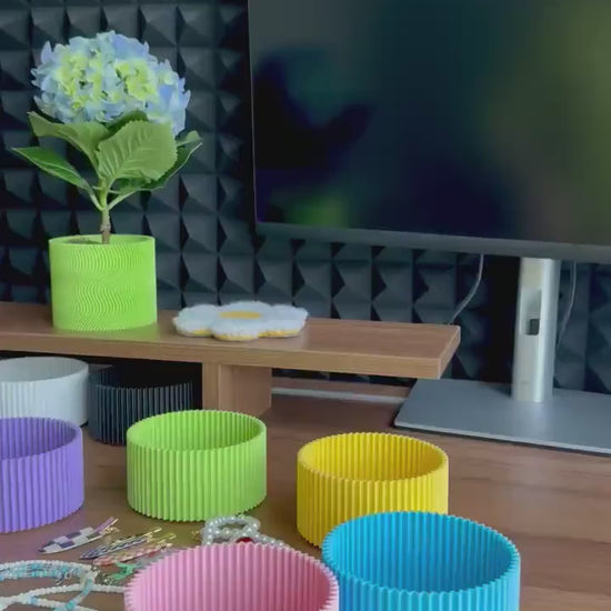 This taller, cylinder-shaped organizer is a perfect choice for those who want to store more items not only conveniently but also in style. The bright colors and wavy surface give it a playful touch, while the practical shape makes it suitable for holding a variety of small items – from office supplies to cosmetics or jewelry. The organizer is stackable, so it easily connects with other organizers from our collection, allowing you to create your own organization system that looks like a colorful design accent.